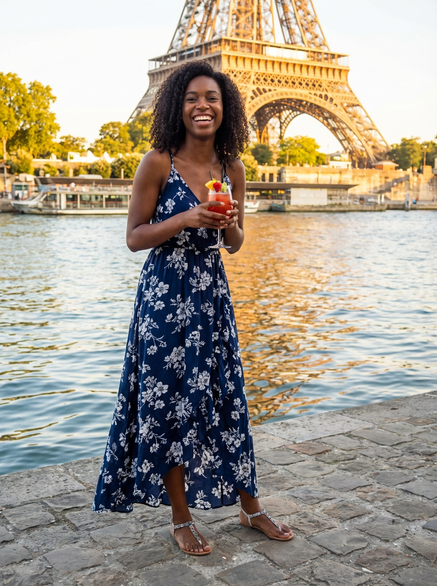 model at Seine River during sunset, wearing a elegant summer dress with floral pattern , holding a glass mocktail