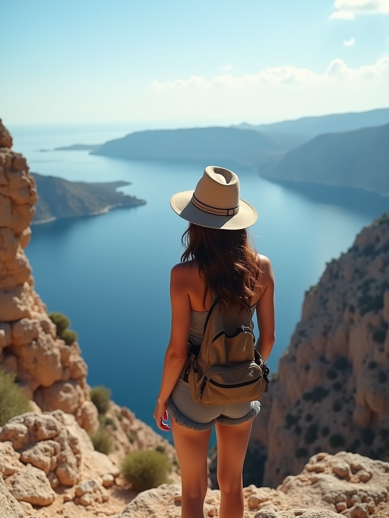 model at Skaros Rock viewpoint, wearing an adventurous hiking outfit with hat , breathtaking 360-degree island views