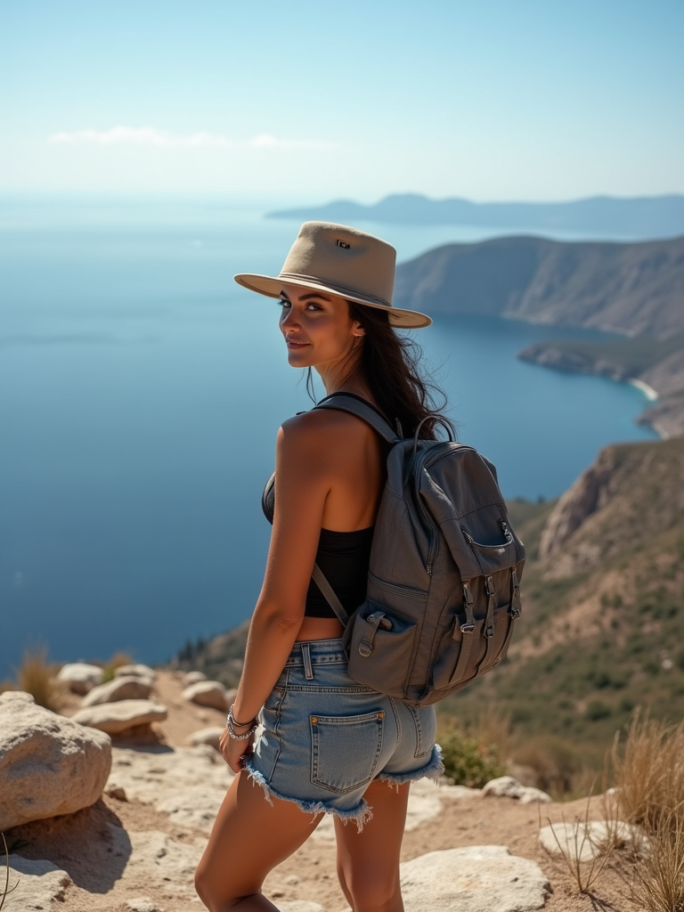 model at Skaros Rock viewpoint, wearing an adventurous hiking outfit with hat , breathtaking 360-degree island views