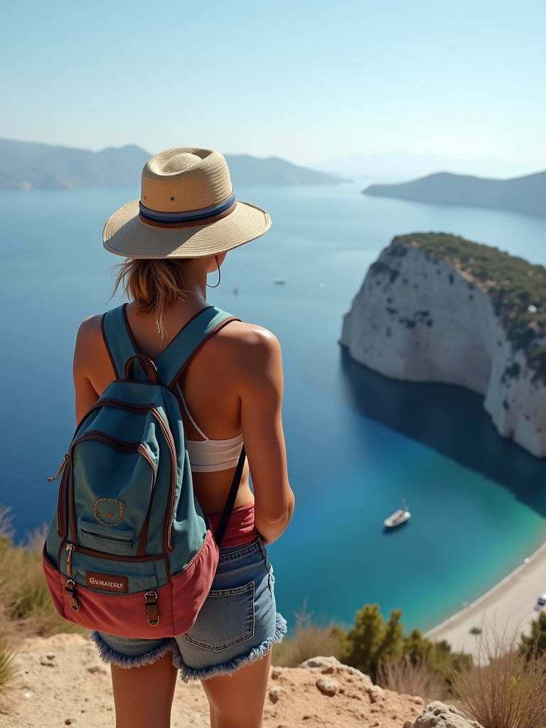 model at Skaros Rock viewpoint, wearing an adventurous hiking outfit with hat , breathtaking 360-degree island views