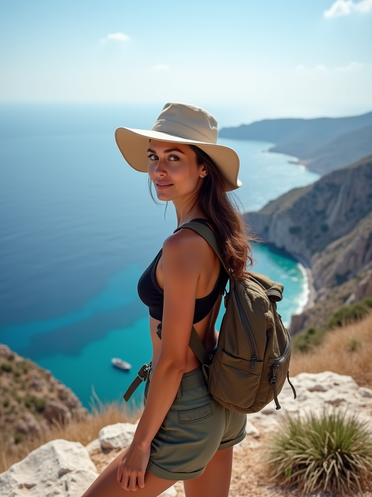 model at Skaros Rock viewpoint, wearing an adventurous hiking outfit with hat , breathtaking 360-degree island views
