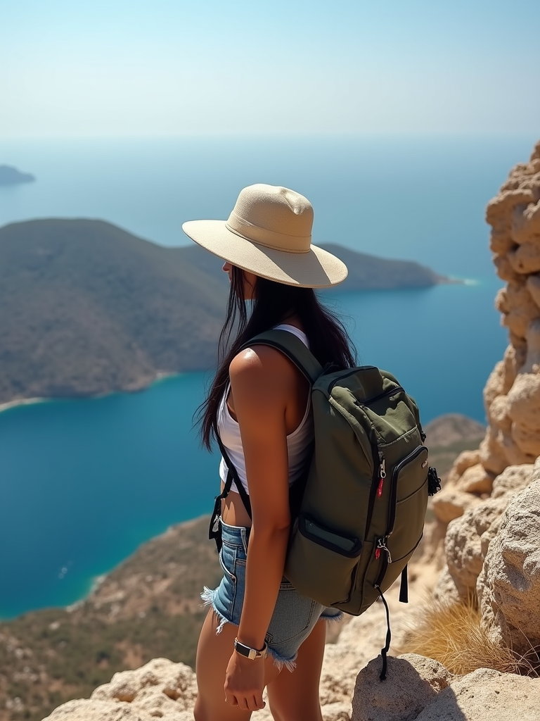 model at Skaros Rock viewpoint, wearing an adventurous hiking outfit with hat , breathtaking 360-degree island views