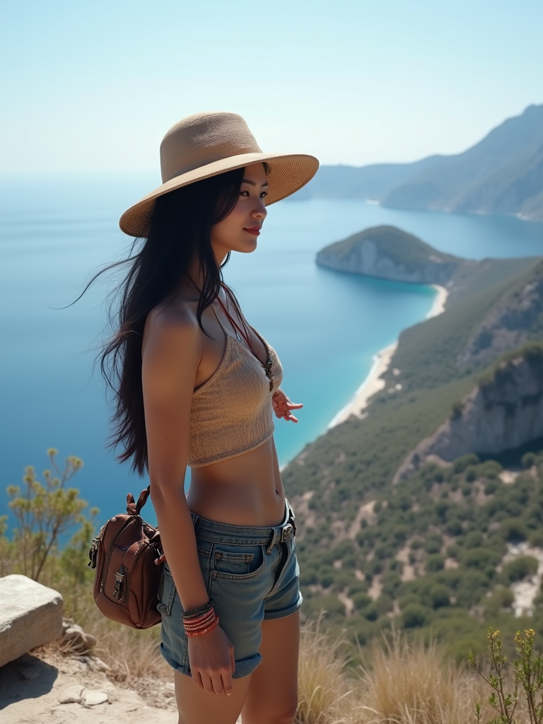 model at Skaros Rock viewpoint, wearing an adventurous hiking outfit with hat , breathtaking 360-degree island views