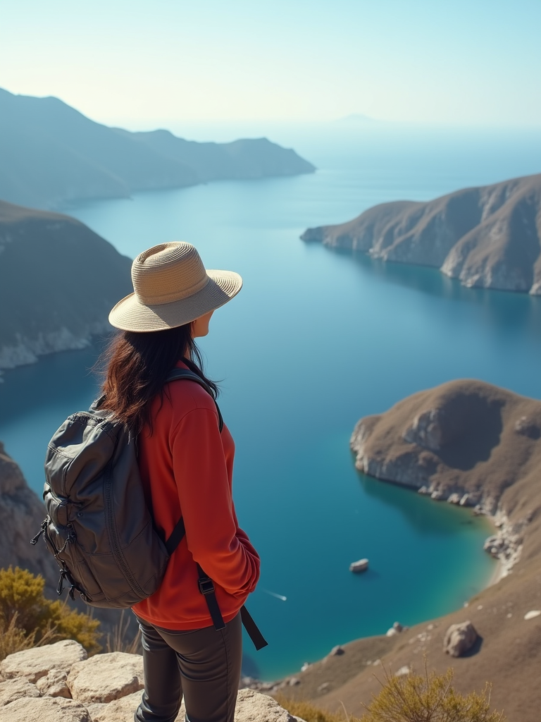model at Skaros Rock viewpoint, wearing an adventurous hiking outfit with hat , breathtaking 360-degree island views