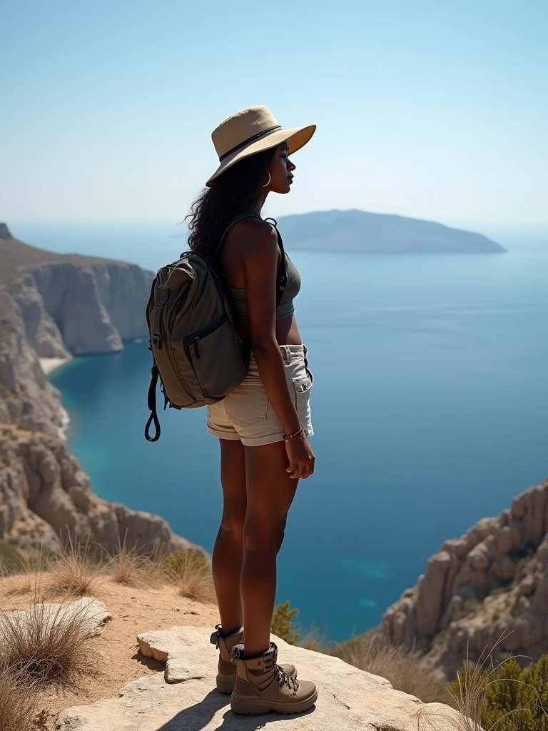 model at Skaros Rock viewpoint, wearing an adventurous hiking outfit with hat , breathtaking 360-degree island views