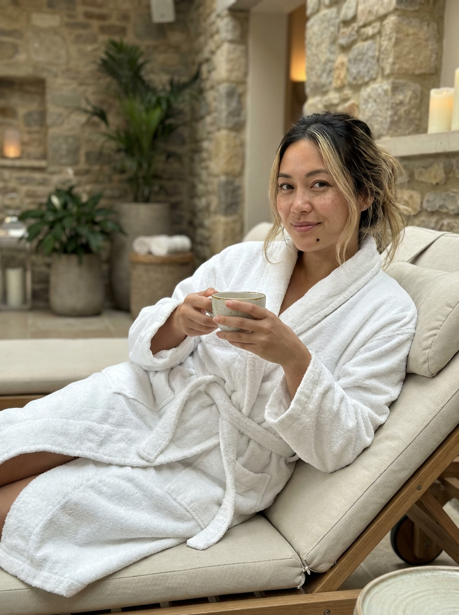 model at spa day, Mothers Day pampering, luxurious robe, relaxation treatment, serene expression