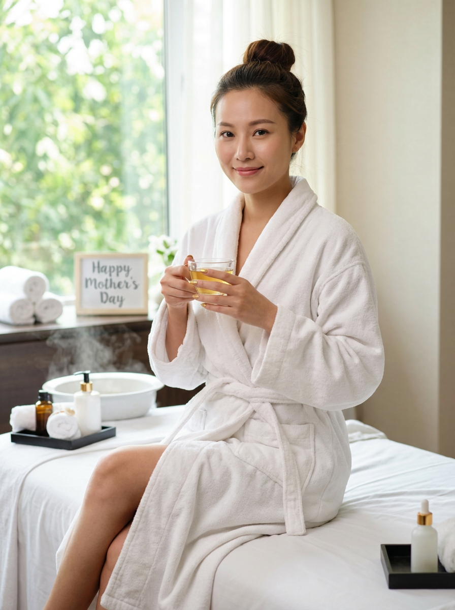 model at spa day, Mothers Day pampering, luxurious robe, relaxation treatment, serene expression