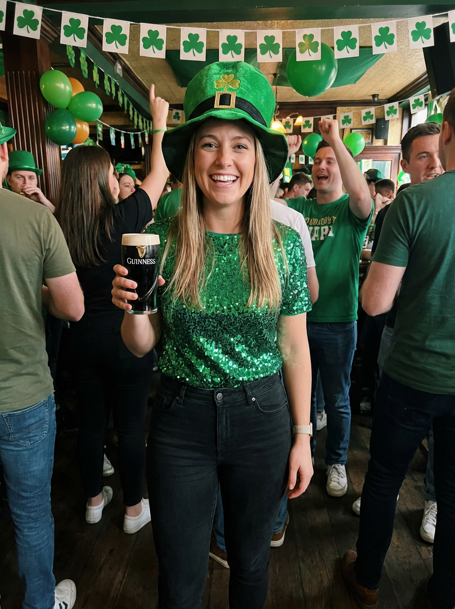 model at St Patricks Day party, green decorations, group celebration vibe, festive attire