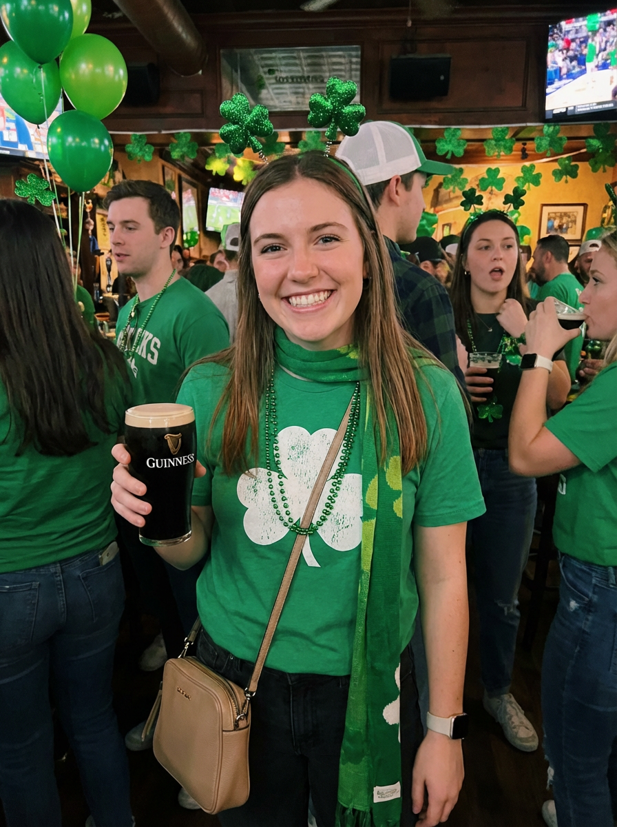 model at St Patricks Day party, green decorations, group celebration vibe, festive attire