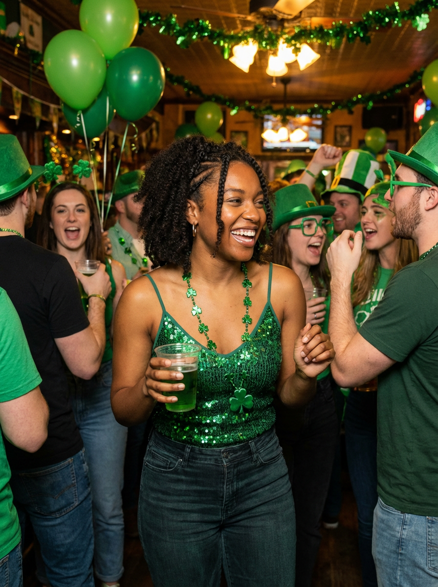 model at St Patricks Day party, green decorations, group celebration vibe, festive attire
