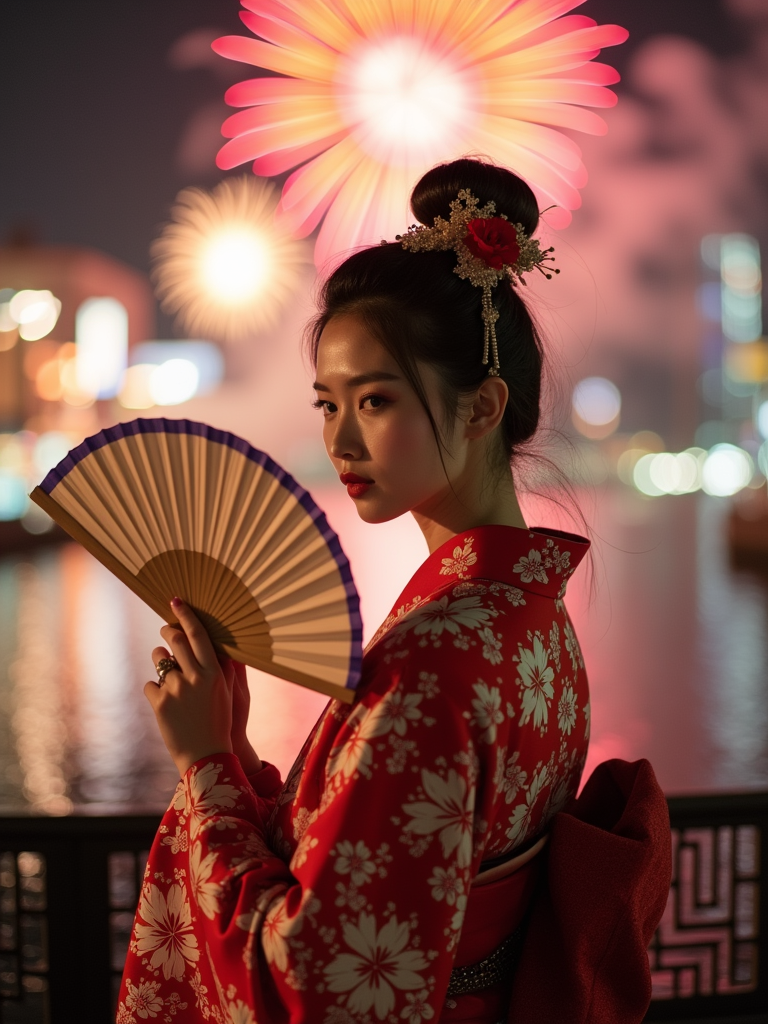 model at Sumida River during fireworks festival, wearing a yukata with floral pattern , holding a paper fan