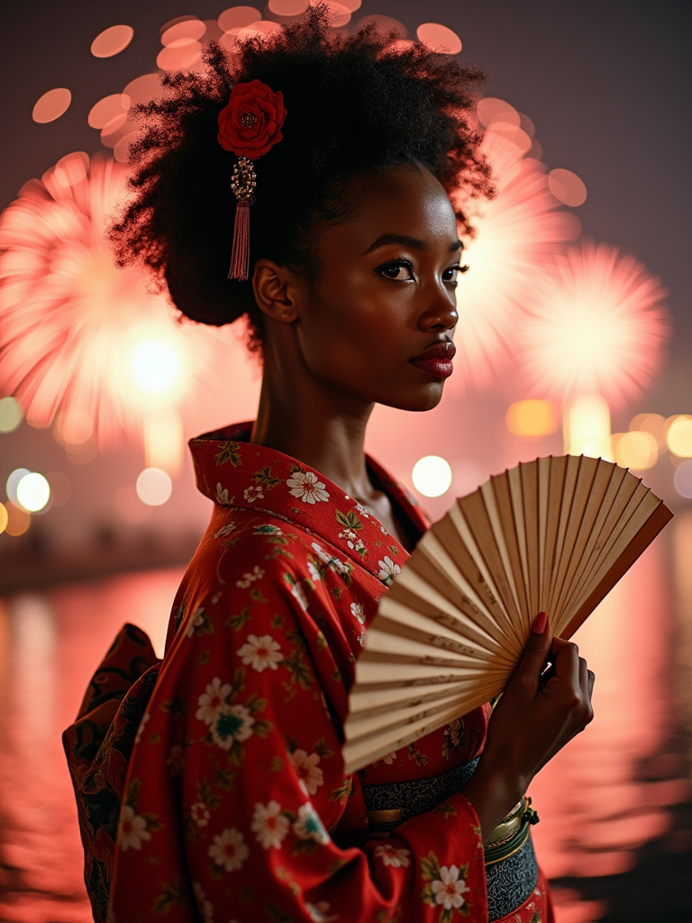 model at Sumida River during fireworks festival, wearing a yukata with floral pattern , holding a paper fan