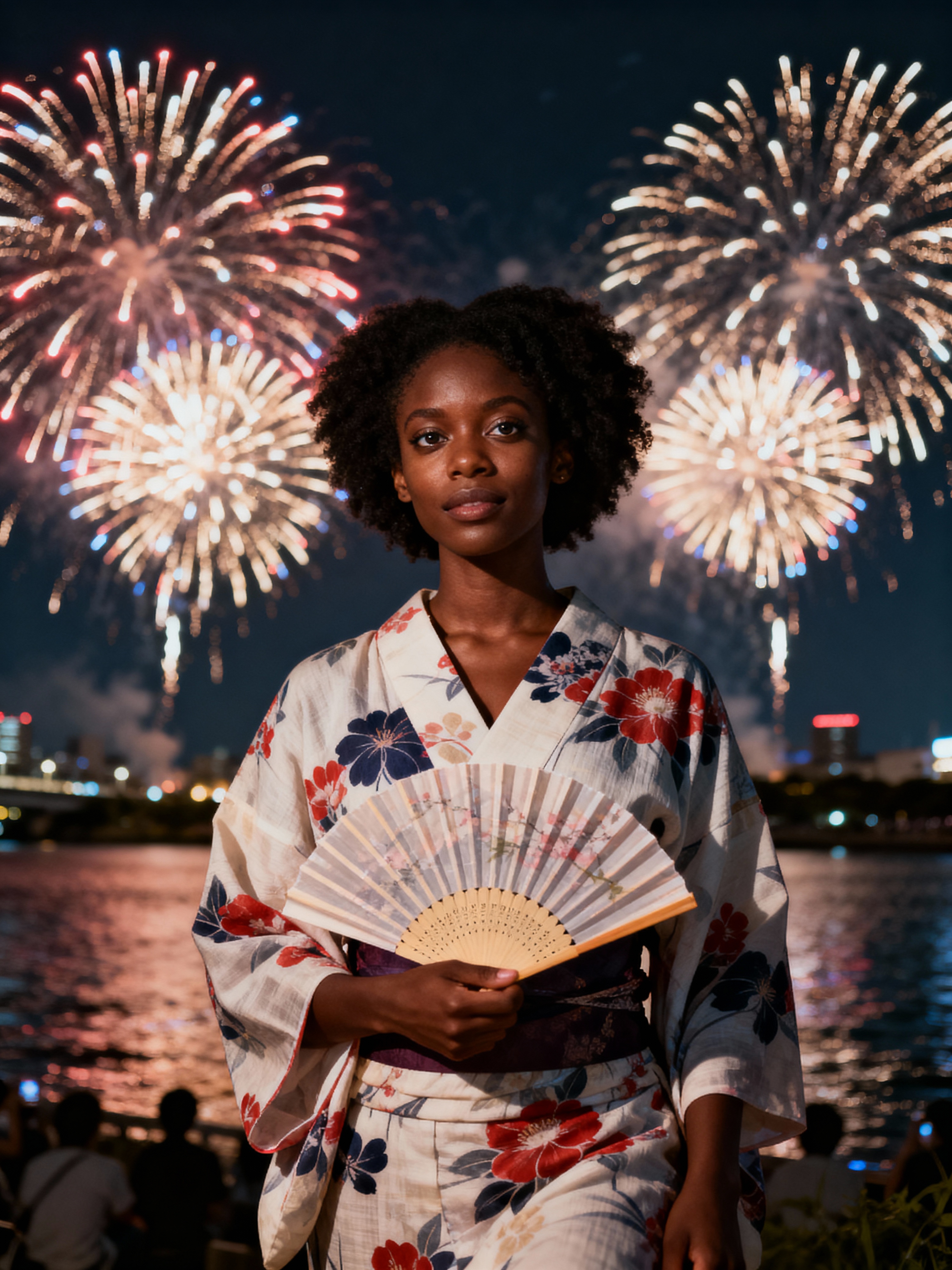 model at Sumida River during fireworks festival, wearing a yukata with floral pattern , holding a paper fan