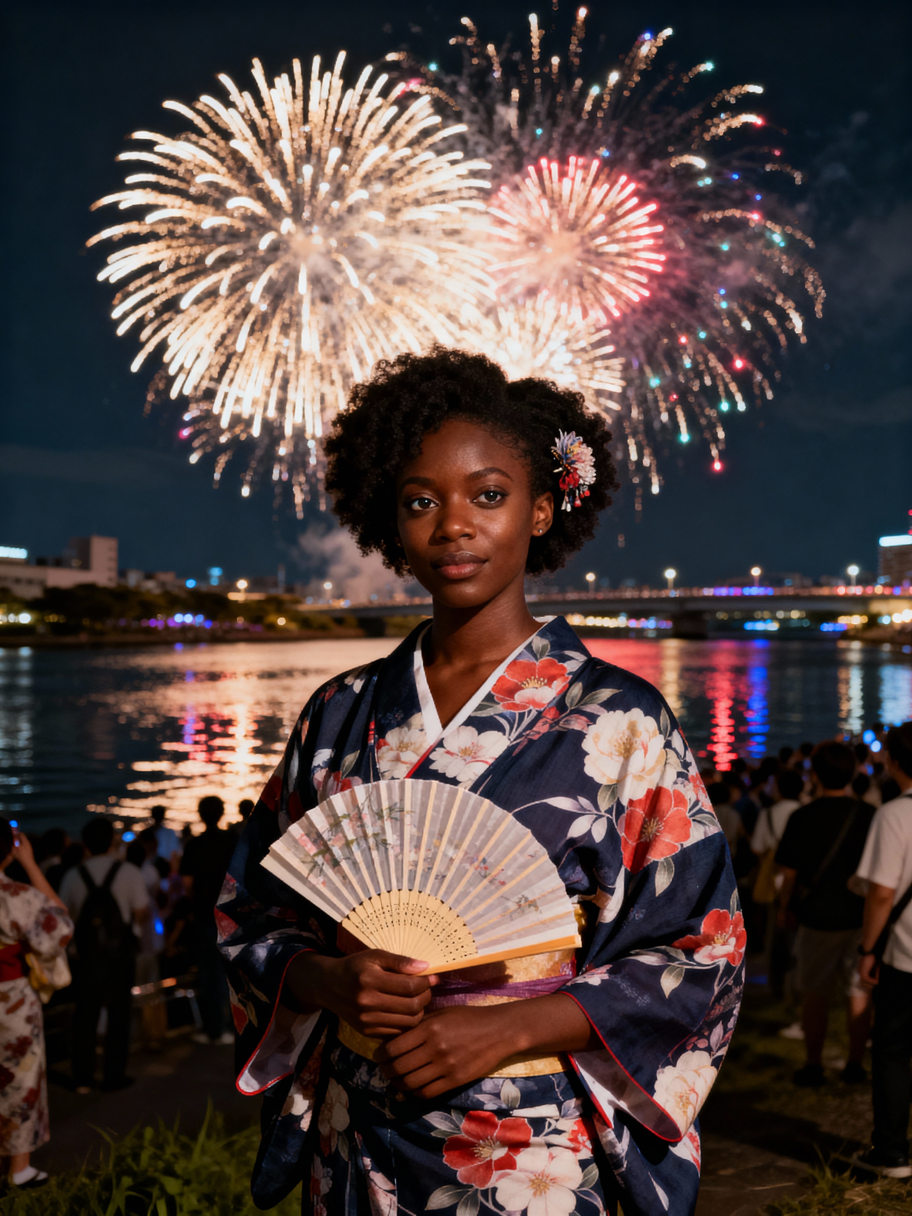 model at Sumida River during fireworks festival, wearing a yukata with floral pattern , holding a paper fan