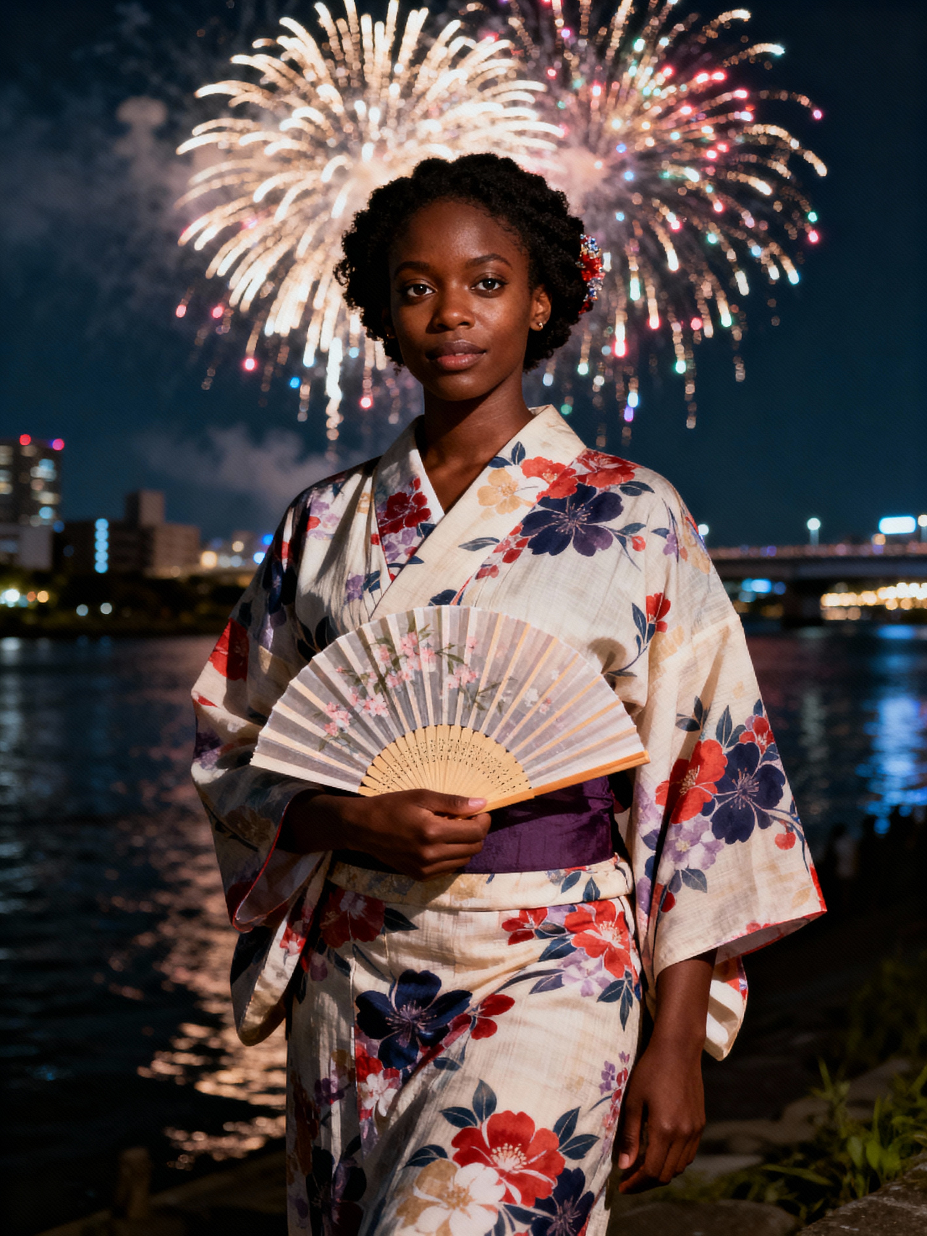 model at Sumida River during fireworks festival, wearing a yukata with floral pattern , holding a paper fan