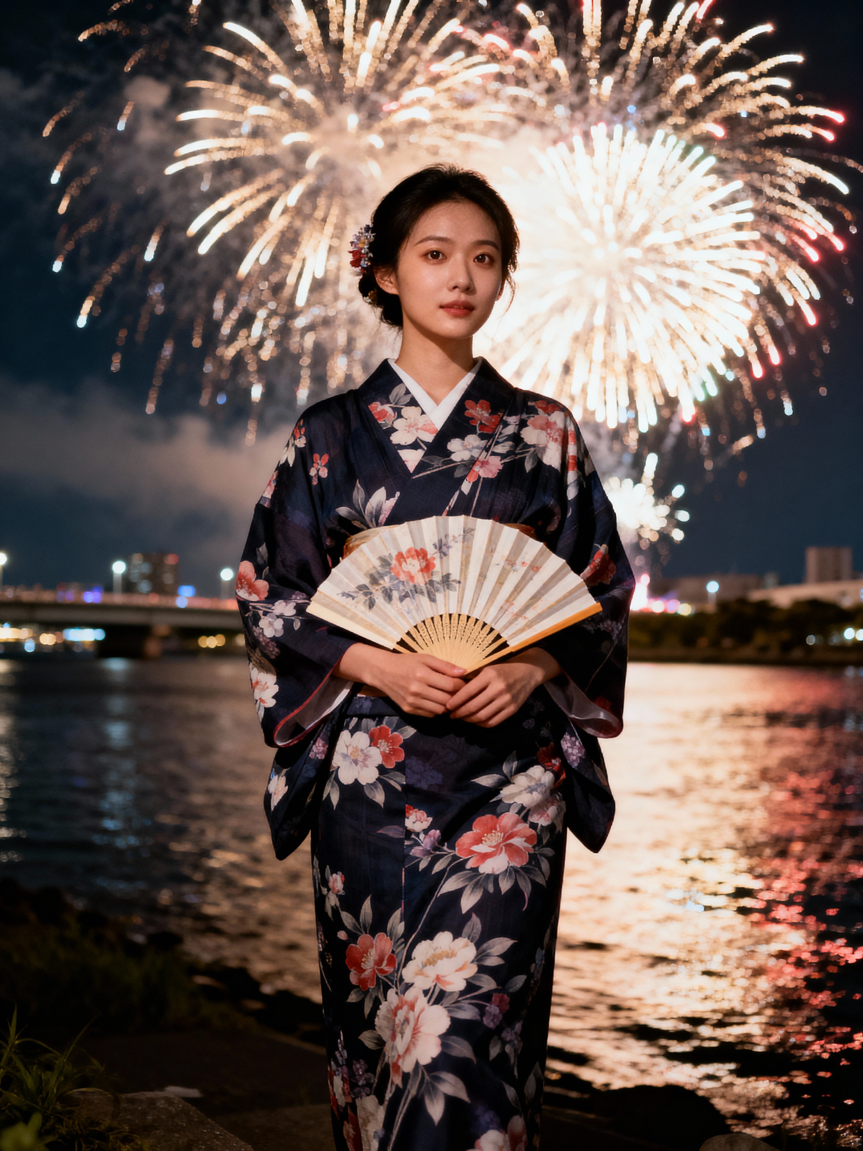 model at Sumida River during fireworks festival, wearing a yukata with floral pattern , holding a paper fan