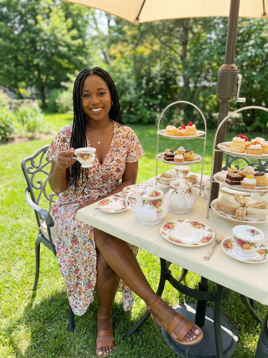 model at tea party setting, elegant china, spring treats, sophisticated casual outfit