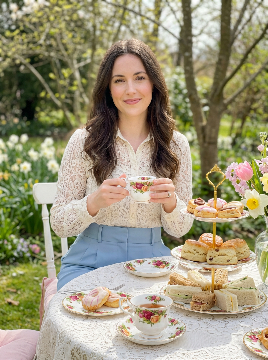 model at tea party setting, elegant china, spring treats, sophisticated casual outfit