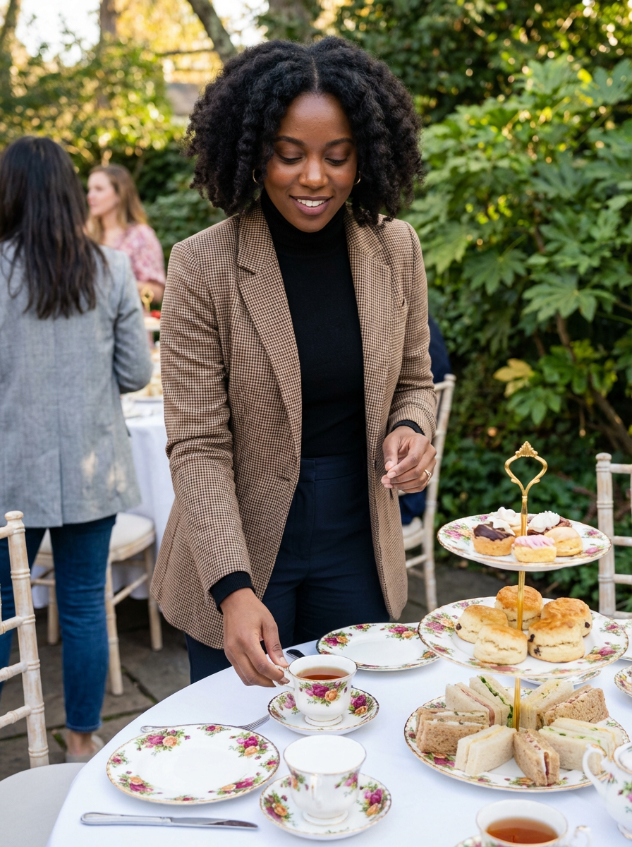model at tea party setting, elegant china, spring treats, sophisticated casual outfit