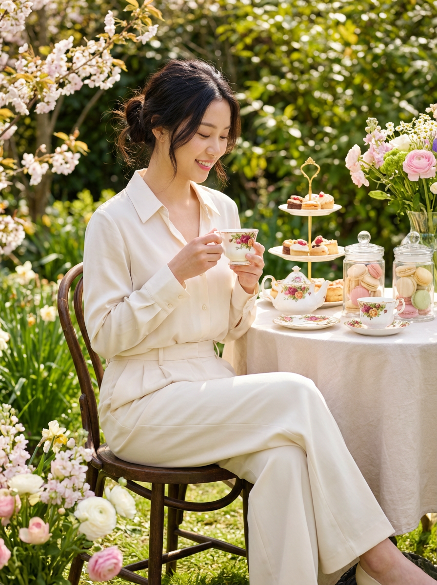 model at tea party setting, elegant china, spring treats, sophisticated casual outfit