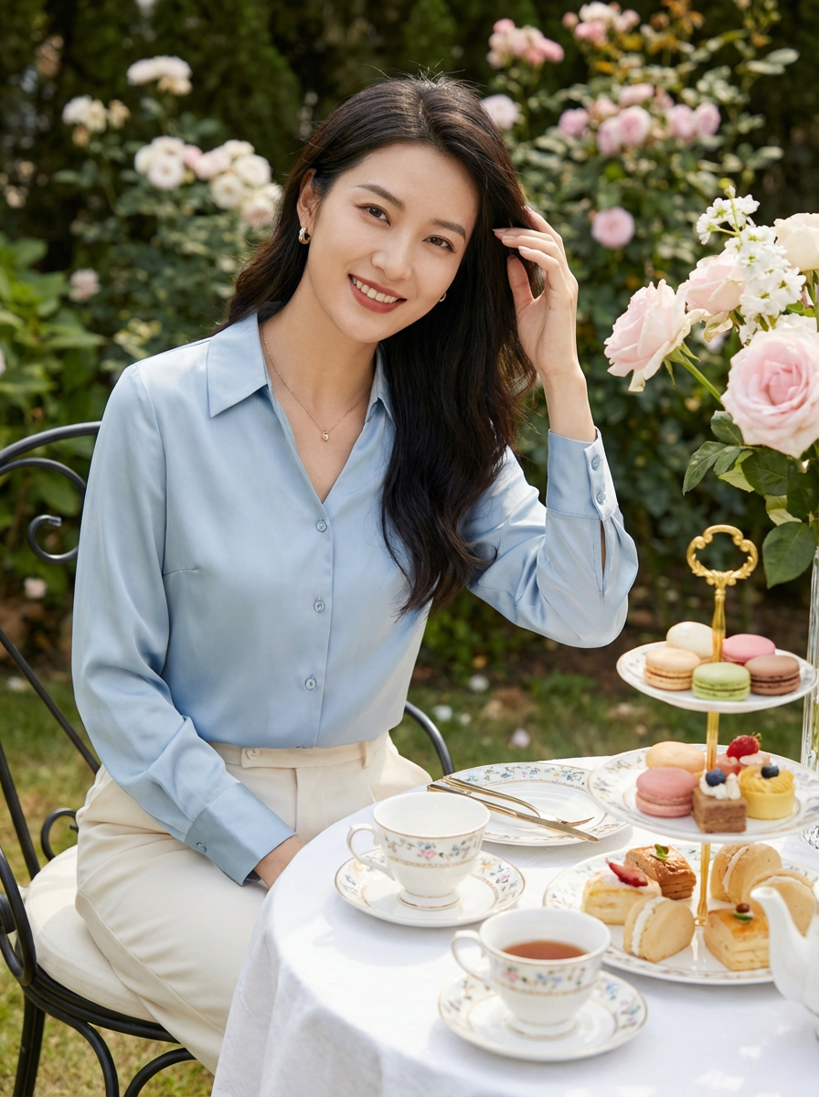 model at tea party setting, elegant china, spring treats, sophisticated casual outfit