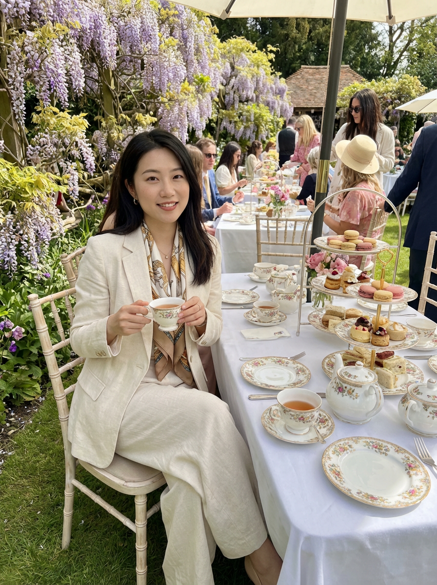 model at tea party setting, elegant china, spring treats, sophisticated casual outfit