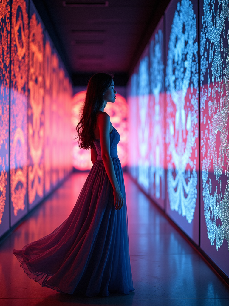 model at teamLab Borderless digital art museum, wearing a flowing maxi dress , surrounded by digital light installations