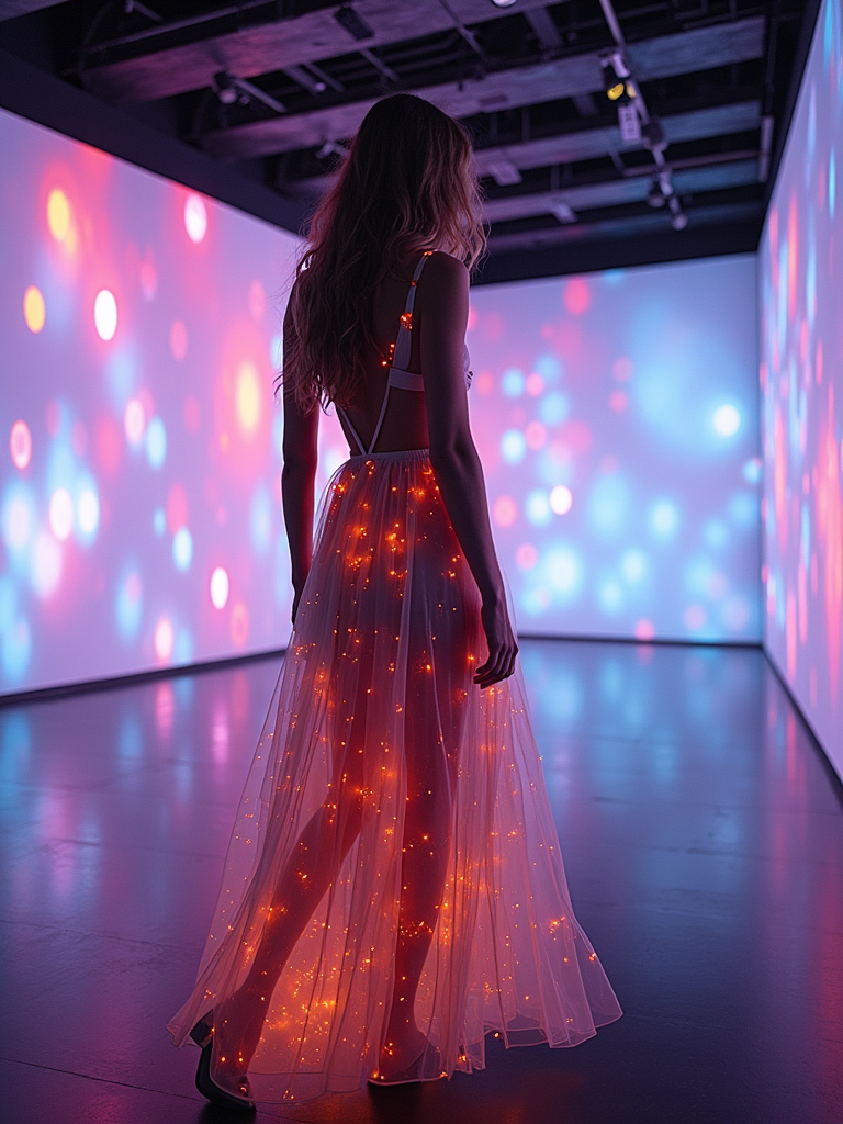 model at teamLab Borderless digital art museum, wearing a flowing maxi dress , surrounded by digital light installations