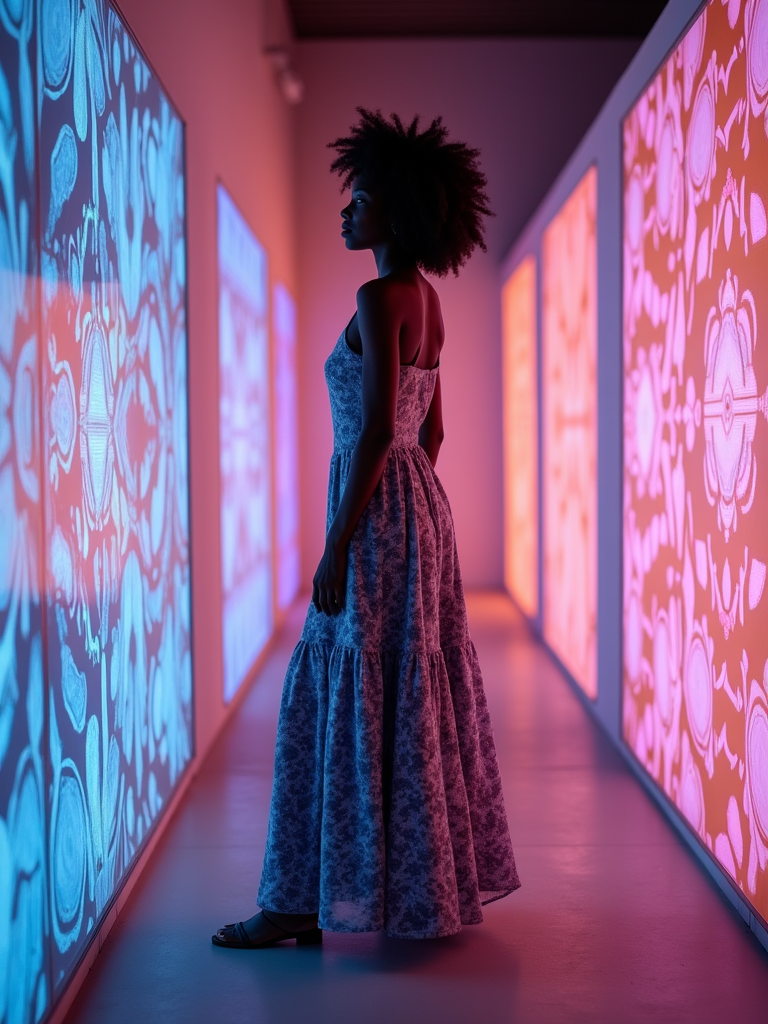 model at teamLab Borderless digital art museum, wearing a flowing maxi dress , surrounded by digital light installations