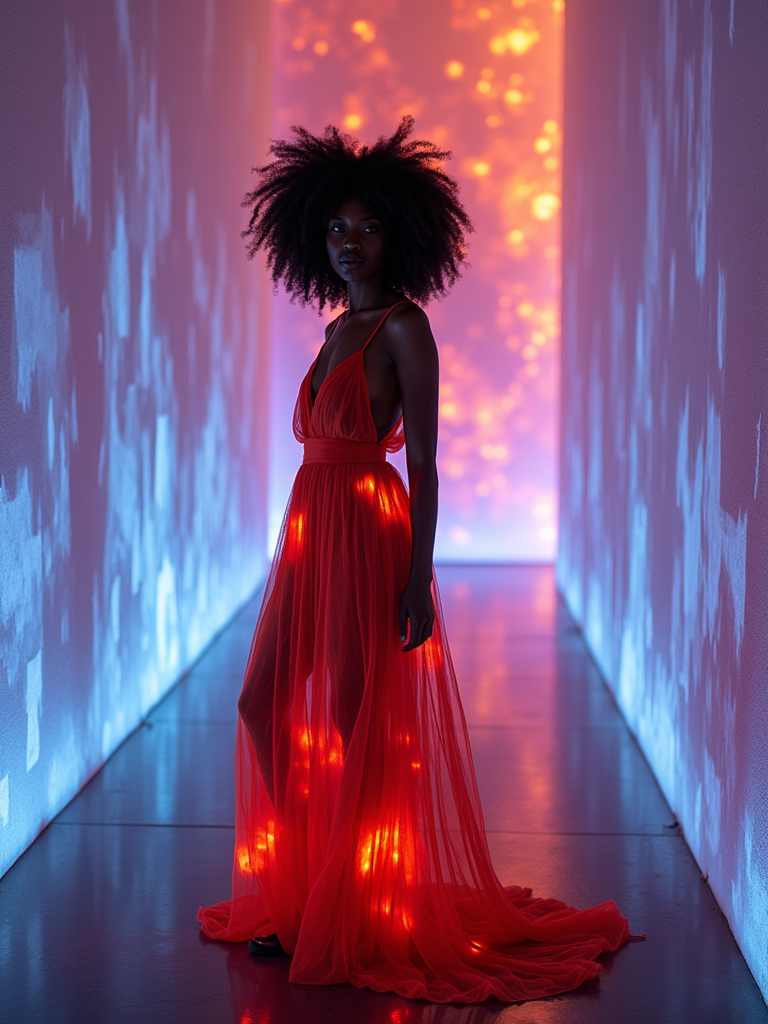 model at teamLab Borderless digital art museum, wearing a flowing maxi dress , surrounded by digital light installations