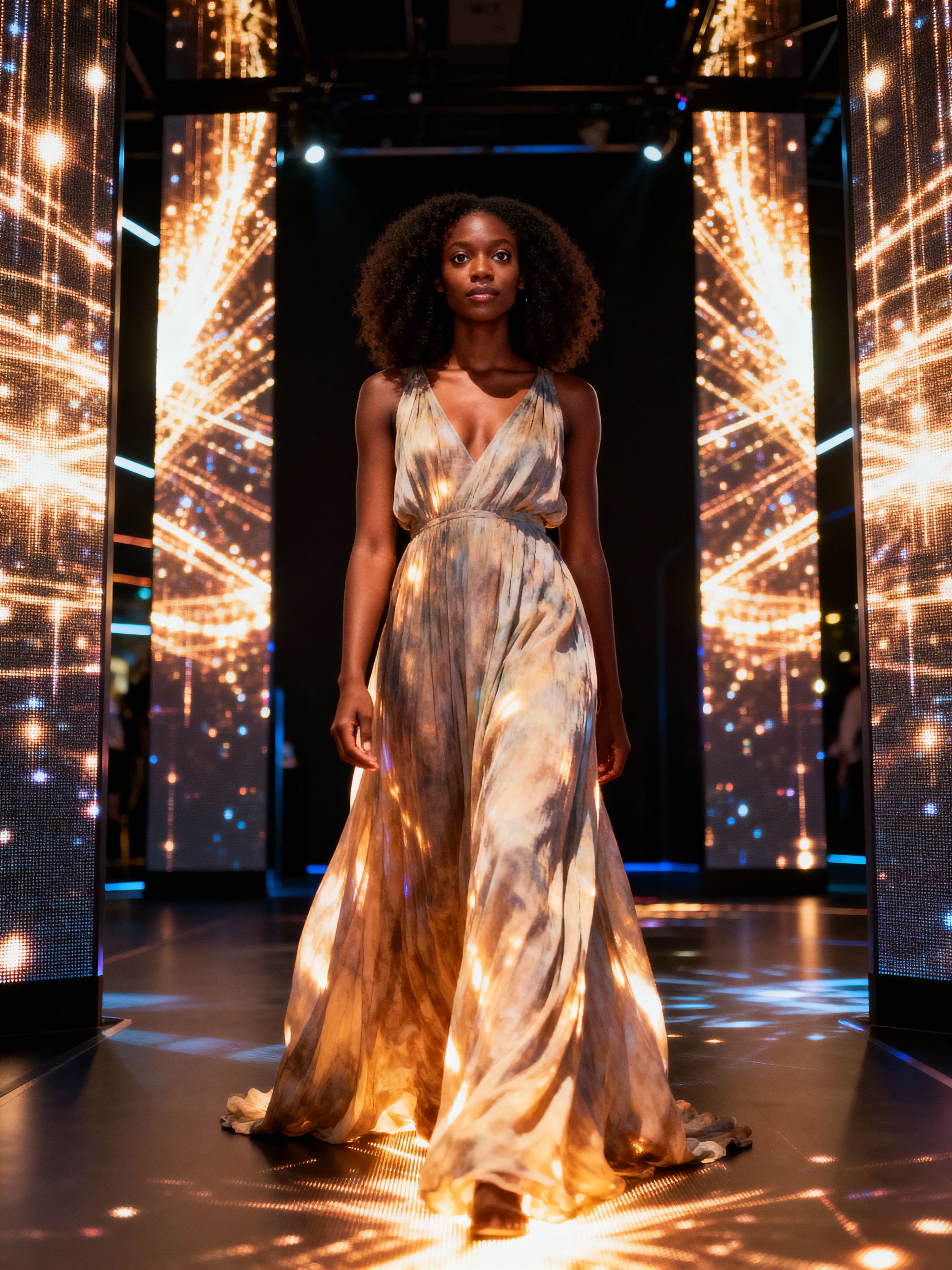 model at teamLab Borderless digital art museum, wearing a flowing maxi dress , surrounded by digital light installations