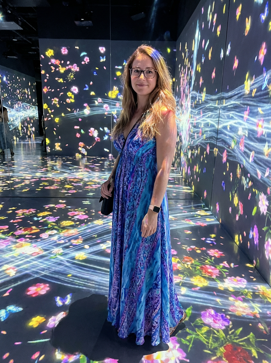 model at teamLab Borderless digital art museum, wearing a flowing maxi dress , surrounded by digital light installations