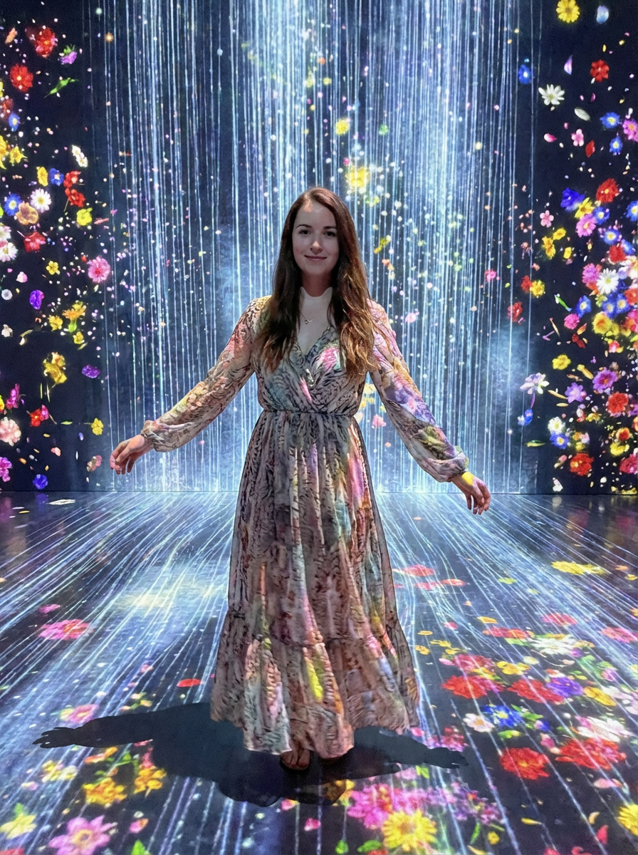 model at teamLab Borderless digital art museum, wearing a flowing maxi dress , surrounded by digital light installations