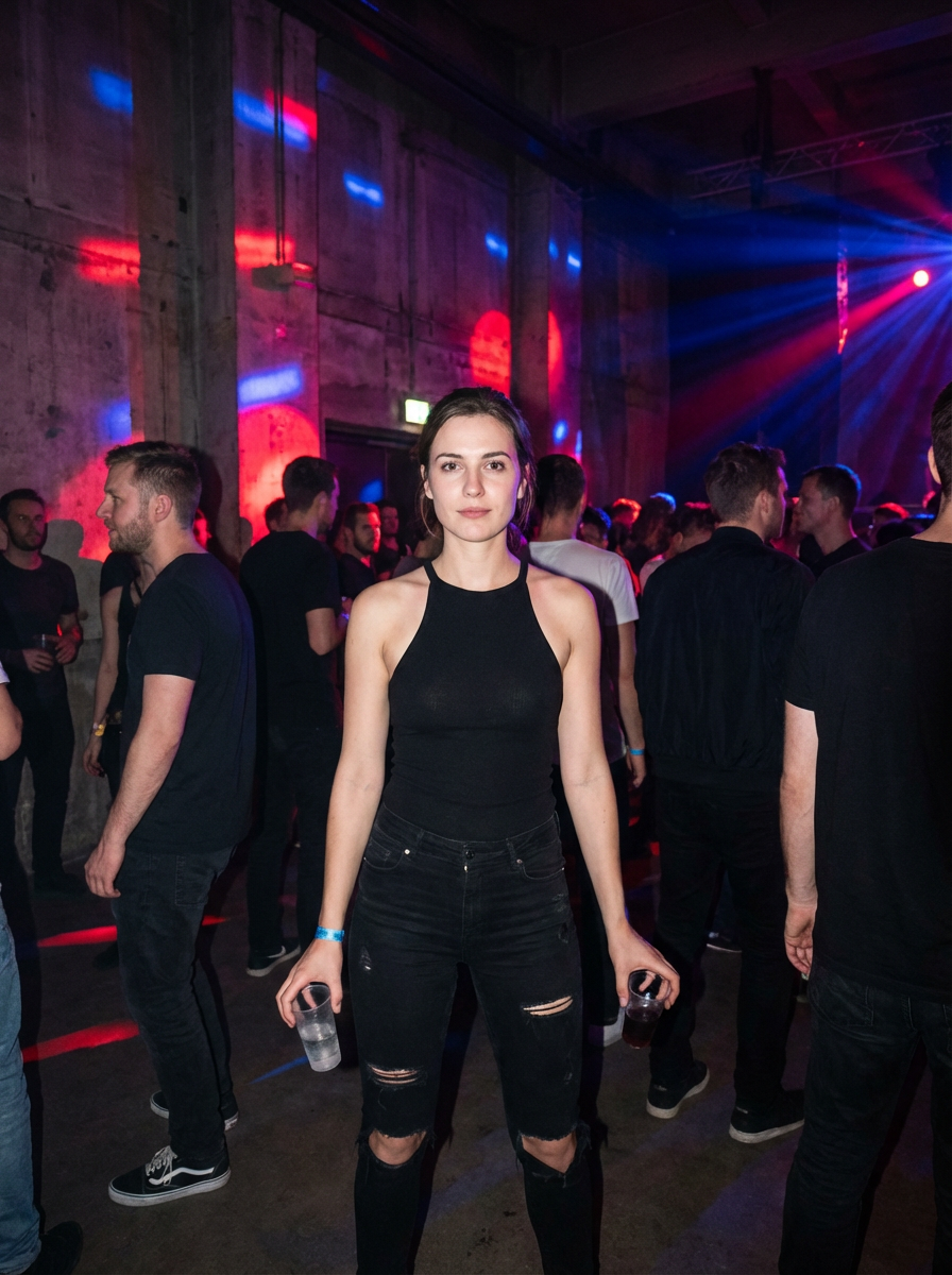 model at techno party in berghain night club in berlin. at night. the model wears a black high neck tanktop. and ripped black jeans.