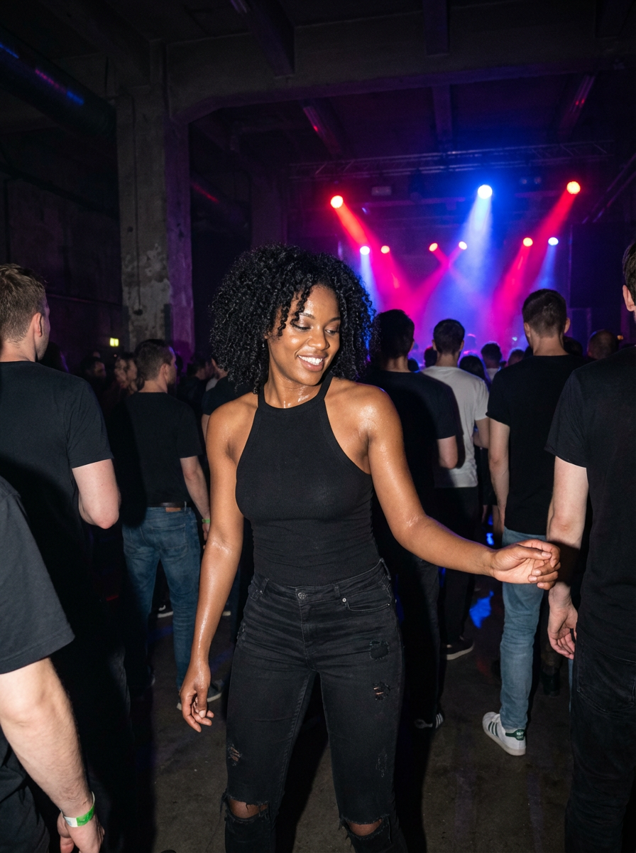 model at techno party in berghain night club in berlin. at night. the model wears a black high neck tanktop. and ripped black jeans.