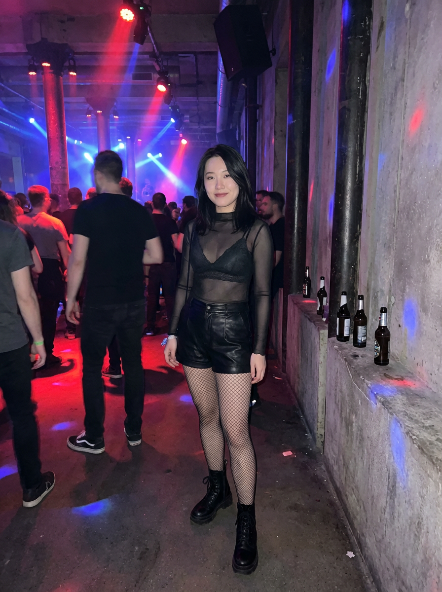 model at techno party in Berghain night club in Berlin. at night. the model wears a black sheer top, black leather shorts, black mesh fishnet stockings. and black boots.