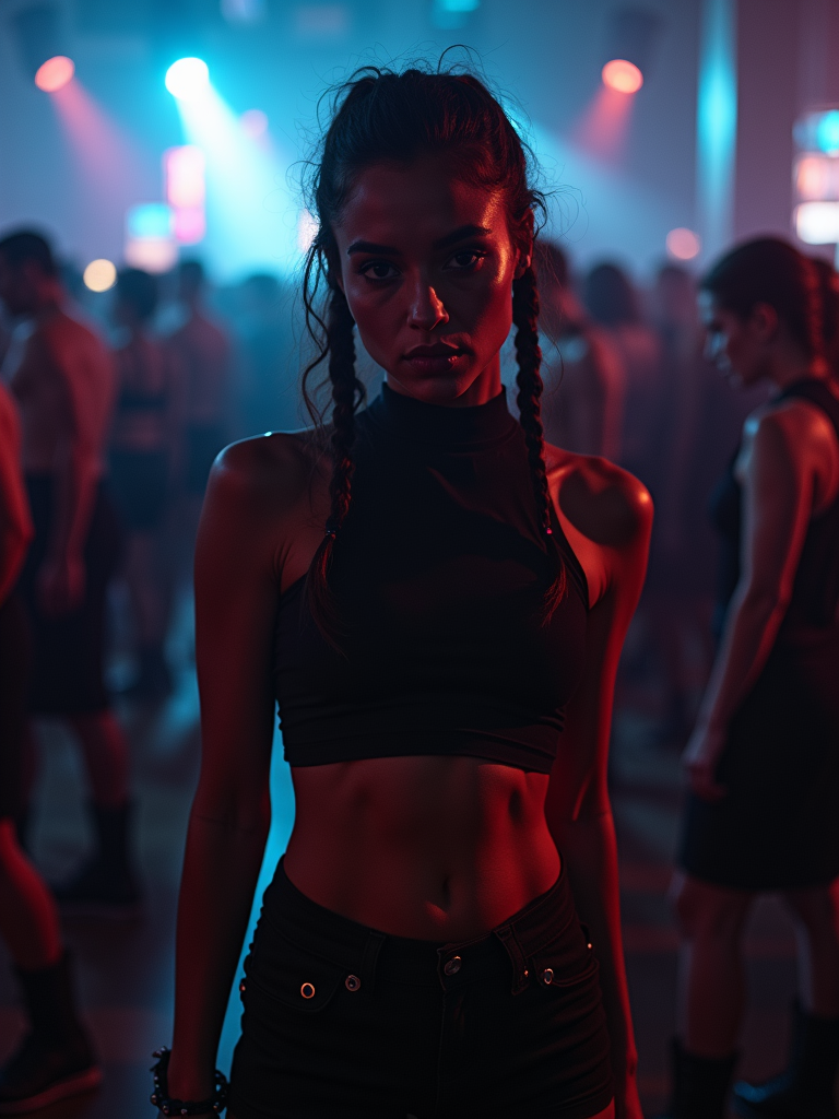 model at techno party in Berghain night club in Berlin. at night. model wears black yoga shorts, black sleeveless high neck top, and black combat boots. pigtails