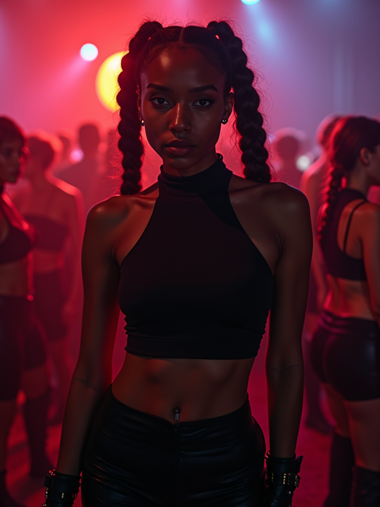 model at techno party in Berghain night club in Berlin. at night. model wears black yoga shorts, black sleeveless high neck top, and black combat boots. pigtails