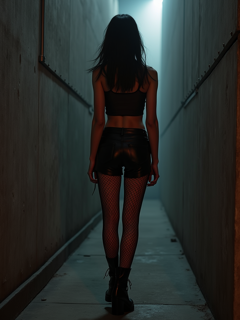 model at techno party in berghain night club in berlin. the night club has concrete walls and is very minimalist. at night. the model wears a black sheer top, black leather shorts, black mesh fishnet stockings. and black boots.