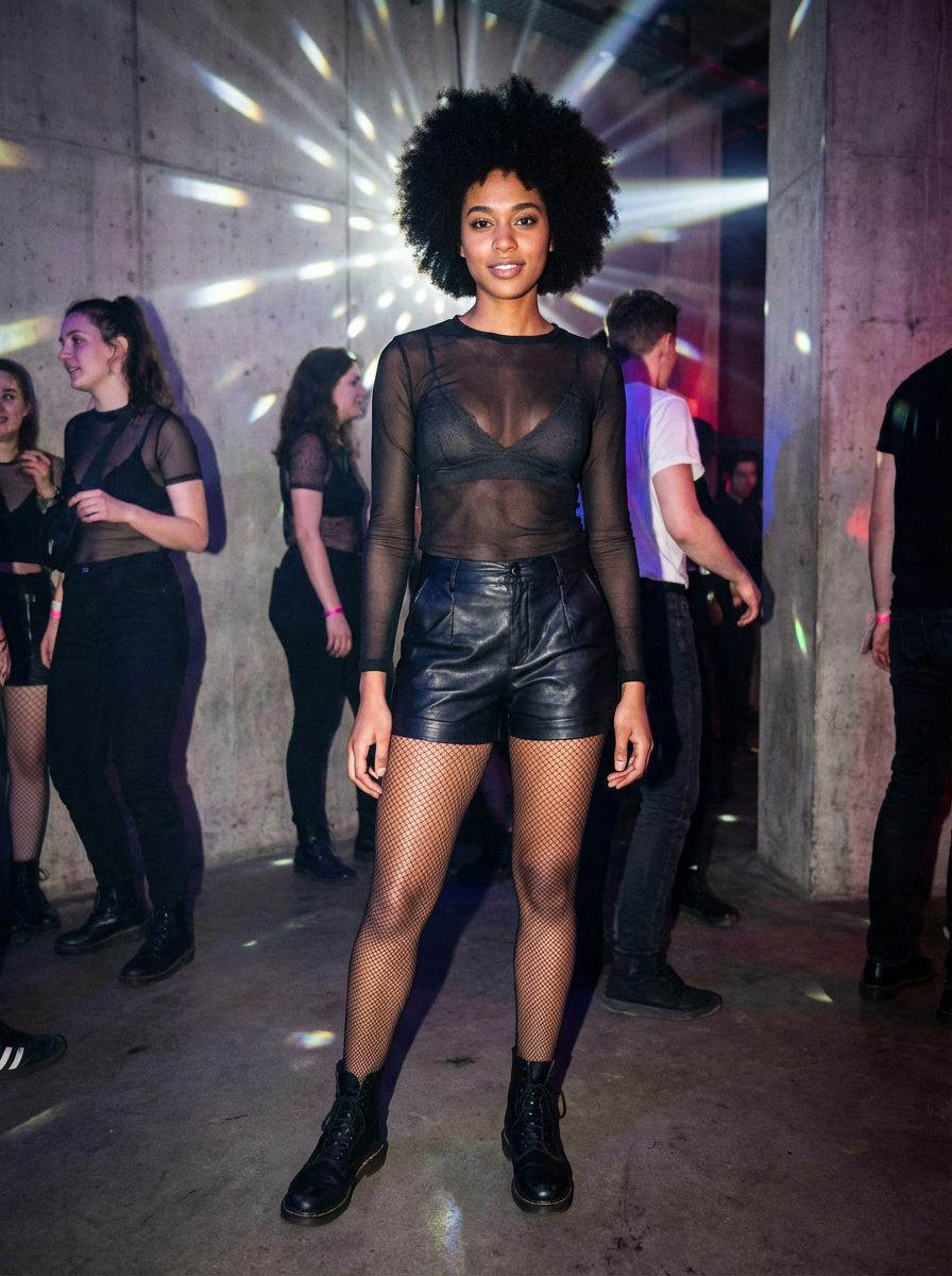 model at techno party in berghain night club in berlin. the night club has concrete walls and is very minimalist. at night. the model wears a black sheer top, black leather shorts, black mesh fishnet stockings. and black boots.
