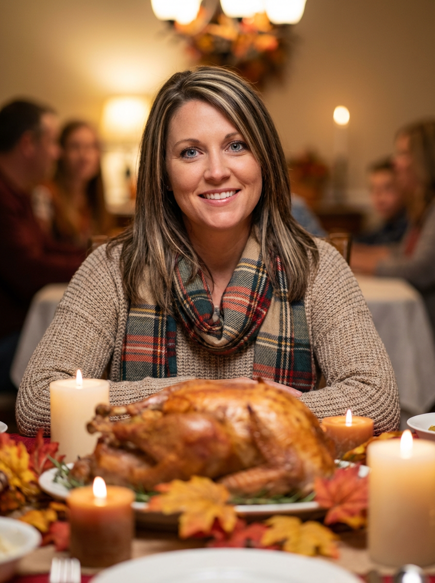 model at Thanksgiving dinner table, beautiful turkey centerpiece, warm candlelight, cozy fall outfit, family gathering atmosphere