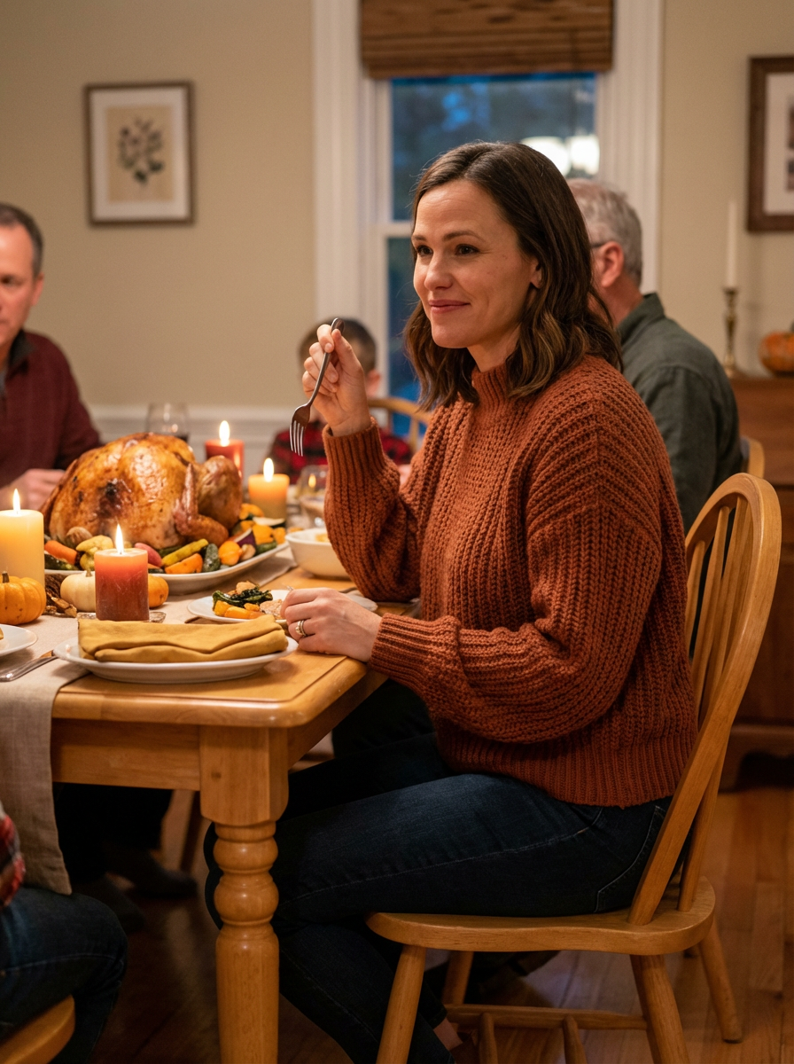 model at Thanksgiving dinner table, beautiful turkey centerpiece, warm candlelight, cozy fall outfit, family gathering atmosphere