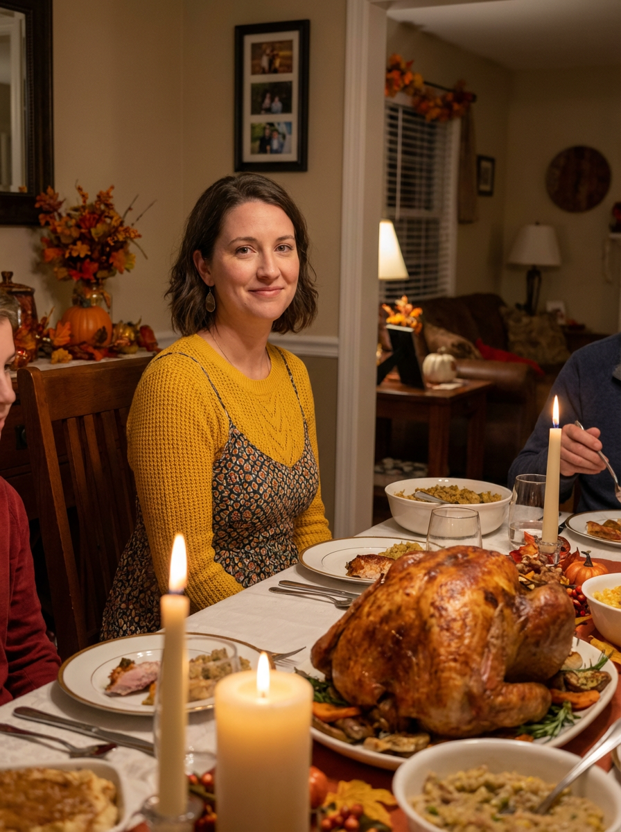 model at Thanksgiving dinner table, beautiful turkey centerpiece, warm candlelight, cozy fall outfit, family gathering atmosphere
