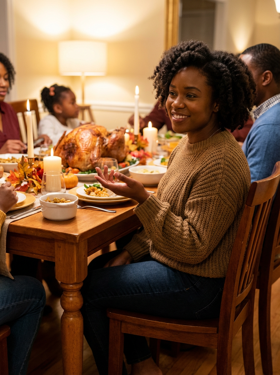 model at Thanksgiving dinner table, beautiful turkey centerpiece, warm candlelight, cozy fall outfit, family gathering atmosphere