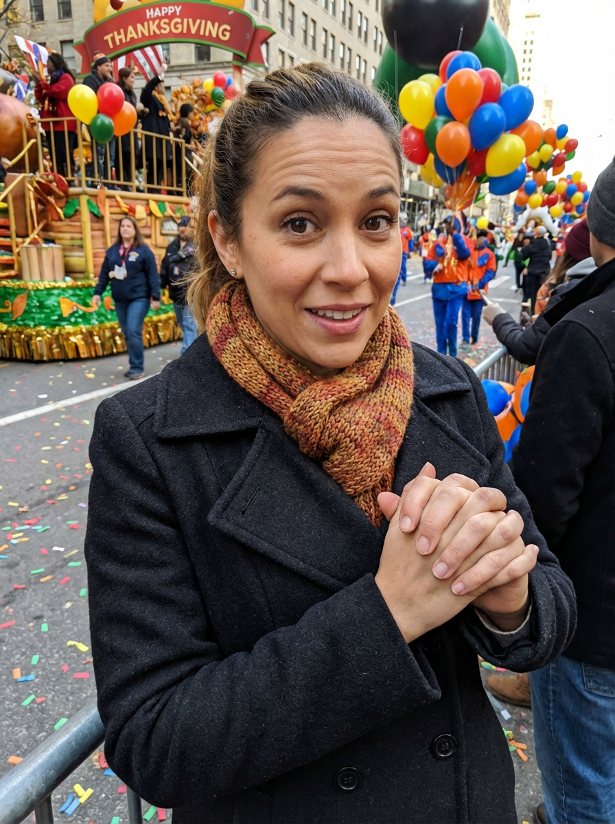 model at Thanksgiving parade, festive crowd, warm coat and scarf, excited expression