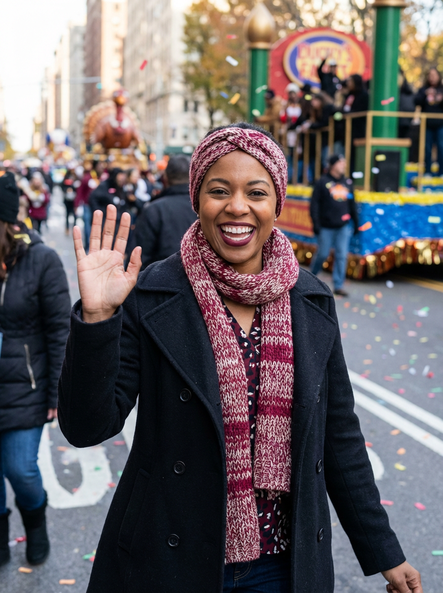 model at Thanksgiving parade, festive crowd, warm coat and scarf, excited expression
