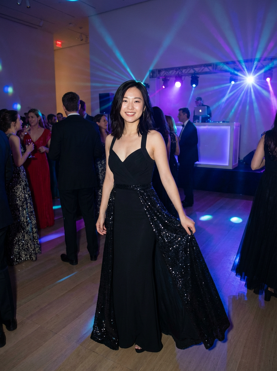 model at the exclusive Met Gala after-party in the museum's modern wing, wearing a transformative evening look with removable elements , celebrity DJs and dance floor with spectacular lighting effects
