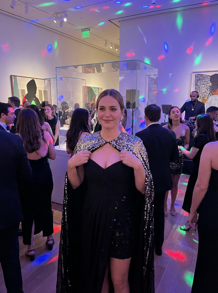 model at the exclusive Met Gala after-party in the museum's modern wing, wearing a transformative evening look with removable elements , celebrity DJs and dance floor with spectacular lighting effects