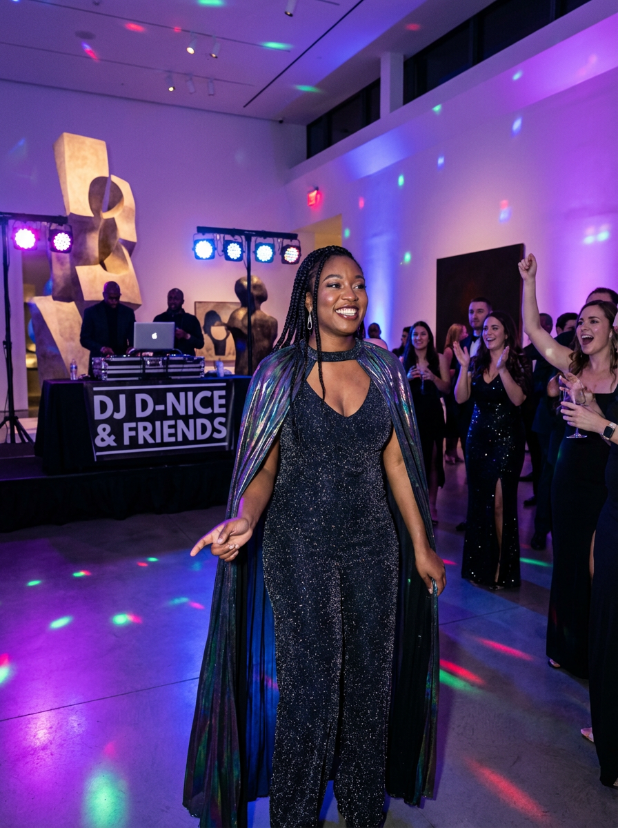 model at the exclusive Met Gala after-party in the museum's modern wing, wearing a transformative evening look with removable elements , celebrity DJs and dance floor with spectacular lighting effects