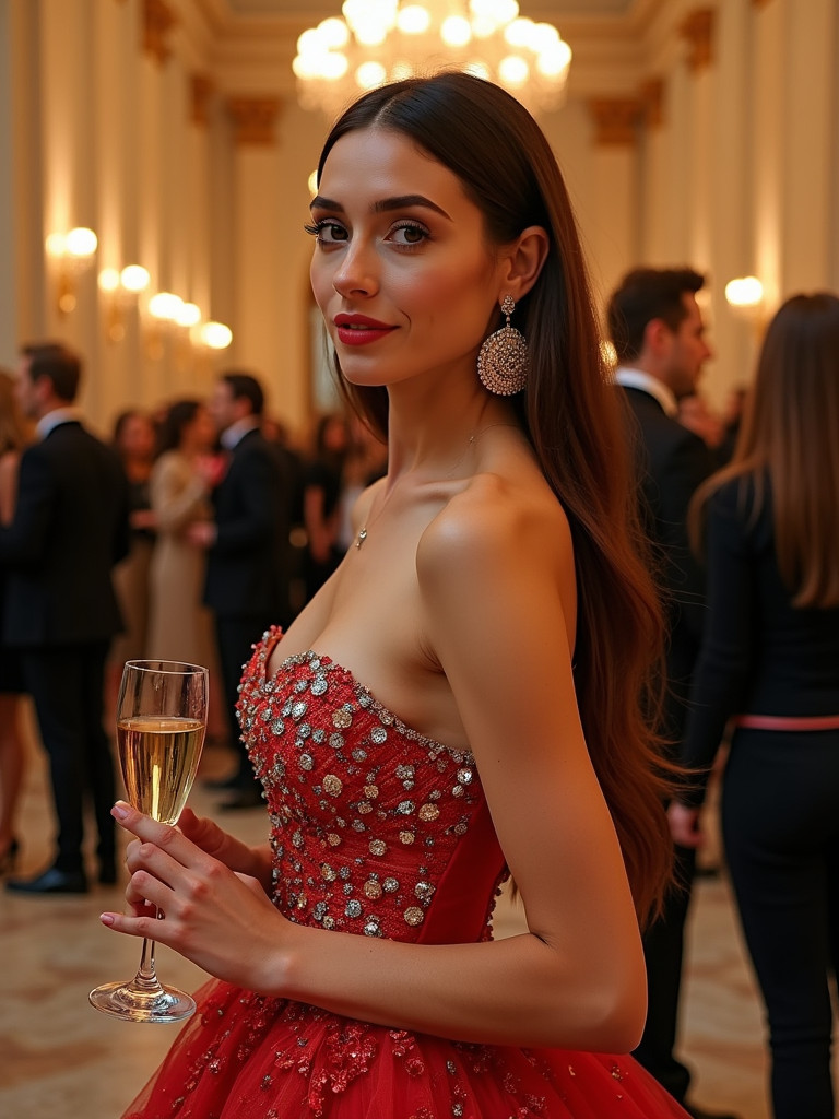model at the exclusive Met Gala cocktail hour in the museum's Great Hall, wearing a dramatic high-fashion gown with innovative materials , champagne flutes and elaborate event décor with this year's theme